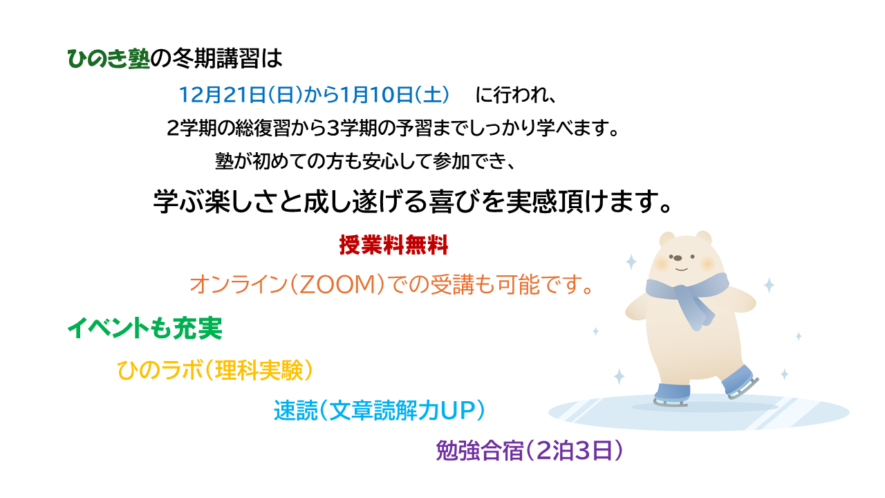 今春、国公立中学校へ最高実績を出した「ひのき塾」が、結果につながる冬休みをお約束します。